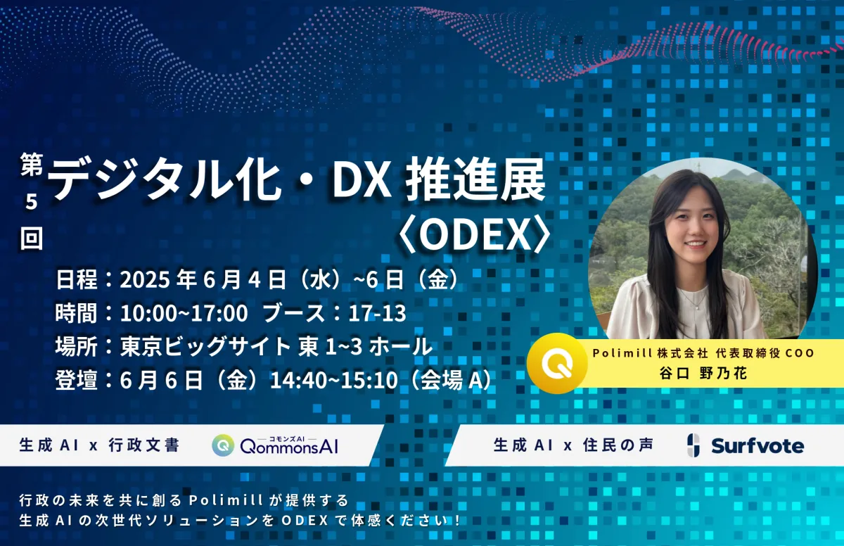 日本のデジタル化は年々進展していますが、地方自治体におけるその実装はまだ多くの課題を抱えています。今回、Polimill株式会社がデジタル化とDX推進をテーマにした「第5回デジタル化・DX推進展 ODEX」に出展し、その成果を発表することとなりました。東京ビッグサイトでのこの展示会は、6月4日から6日の間開催され、Polimillはブース17-13で来場者を迎えます。