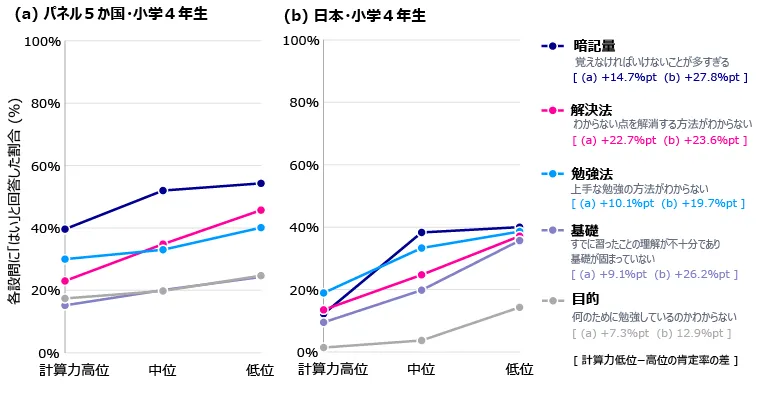 計算力の低い層ほど、今後の課題や不安を感じているとの結果がありました。特に、日本の調査では「わからない点を解消する方法がわからない」ことが計算力向上に影響を与えている可能性が高いことが示されました。これに対処する方法を提供することが、計算力の向上に向けたカギとなりそうです。