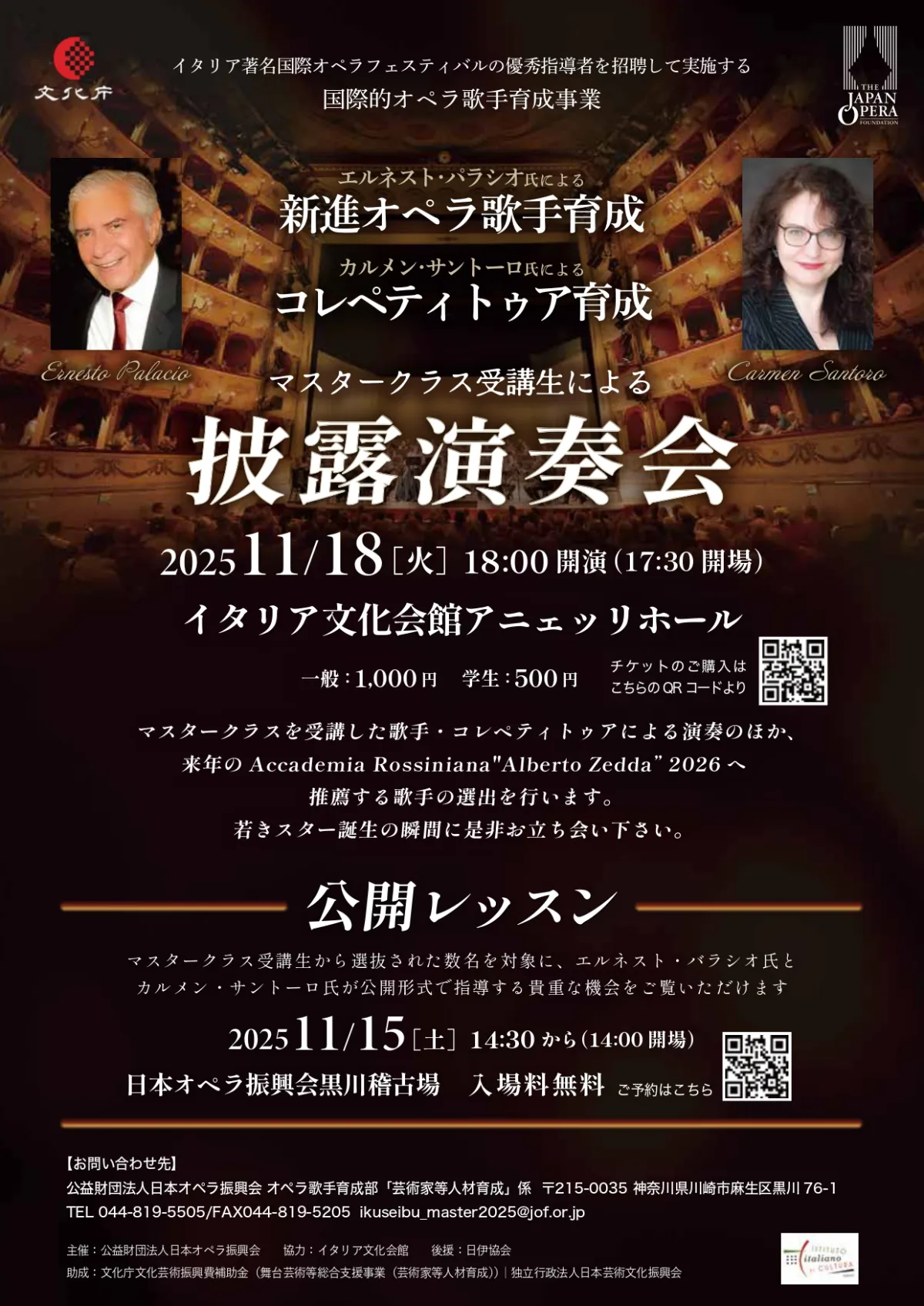公開レッスンでは、マスタークラス受講生の中から選ばれた数名が、エルネスト・パラシオ氏とカルメン・サントーロ氏の指導を受ける貴重な機会となります。観客は、その模様を目の当たりにすることができるため、オペラに興味を持つ方々にとっては見逃せないイベントです。