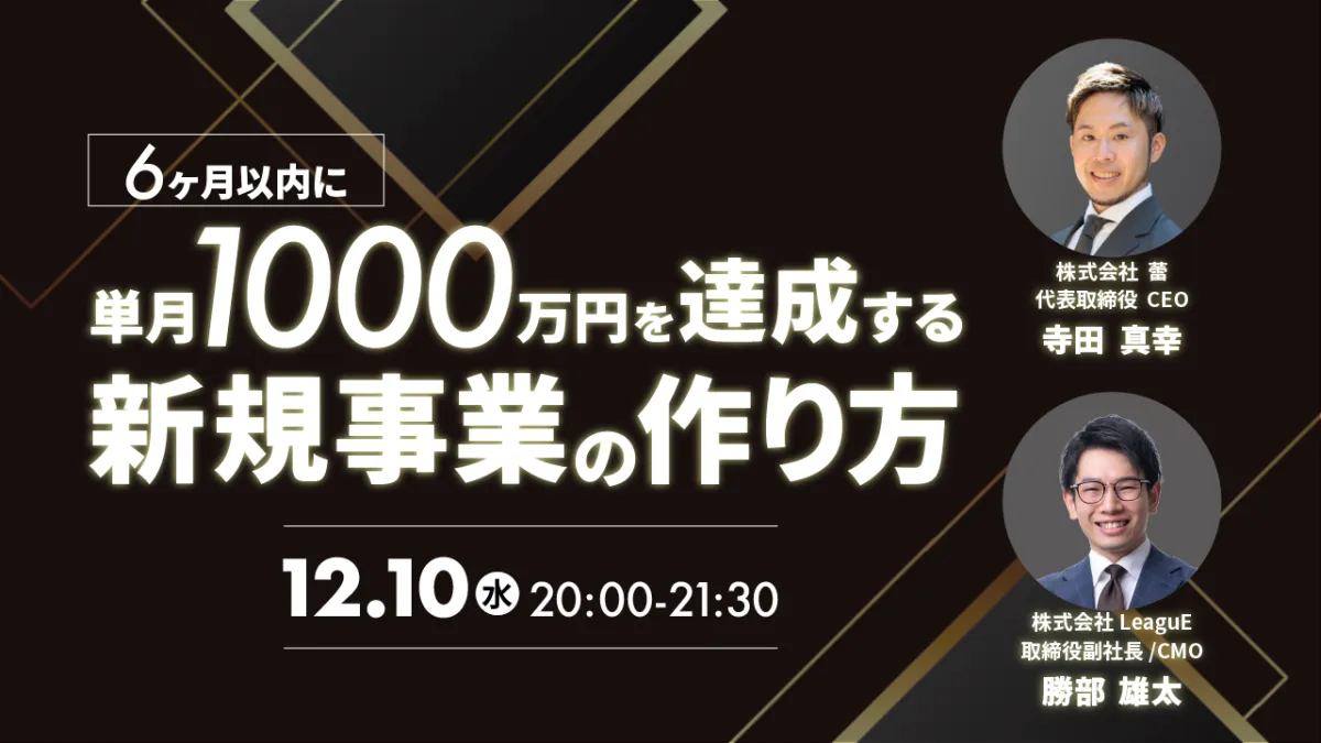 2025年12月10日(水)、株式会社LeaguEと株式会社蕾が共催するオンラインセミナー『6ヶ月以内に単月1000万円を達成する新規事業の作り方』が開催されます。本セミナーでは、短期間で新規事業を立ち上げ、成功に導くための実践的な方法が紹介されます。