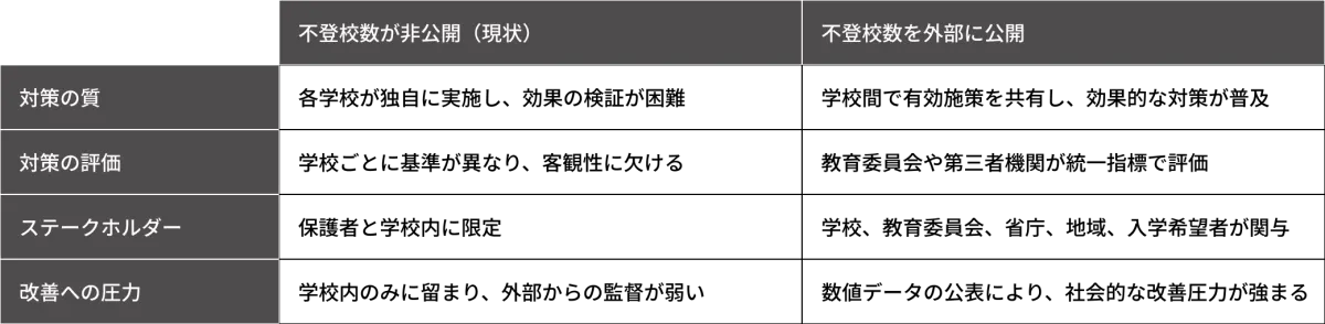 不登校数の公開: 学校ごとの不登校データを公開することで、透明性を確保し、保護者や地域社会の関心を高めることが狙いです。