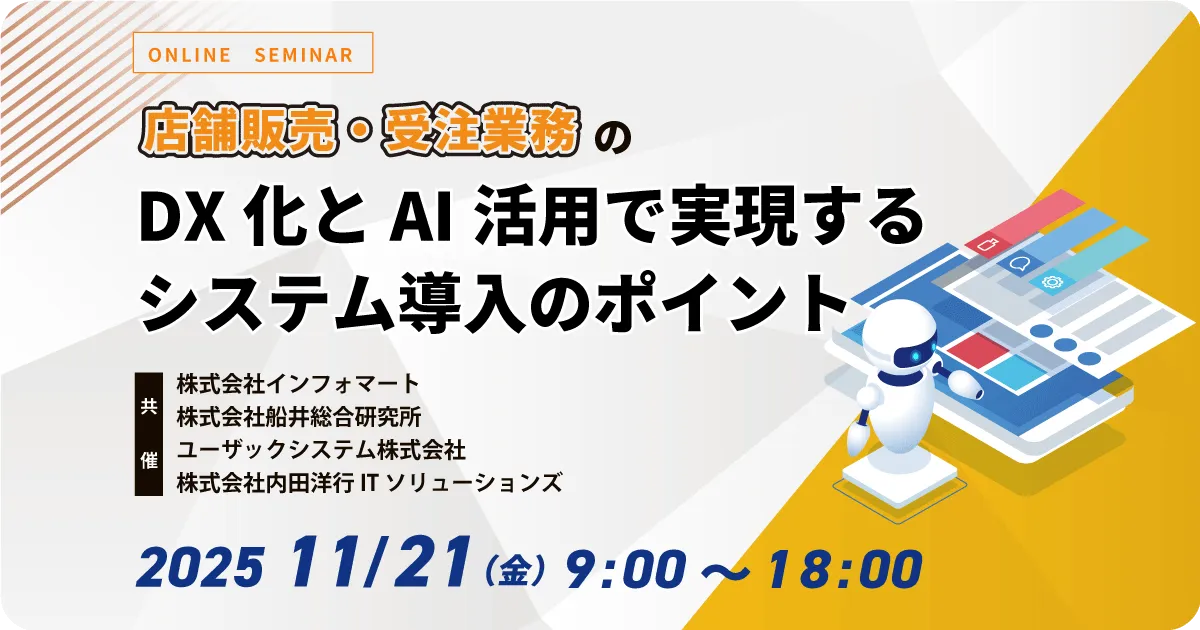 内田洋行ITソリューションズが、2025年11月21日(金)に「店舗販売・受注業務に関する業務改善セミナー」を開催します。このセミナーでは、食品業界が直面している様々な課題に対し、AIや基幹システムを活用した業務の効率化事例を紹介します。