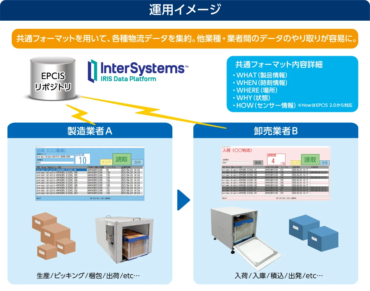 - - EPCIS 2.0適合: 最新のEPCIS 2.0に準拠しており、センサー情報を含め多様な製品情報を管理できます。これにより、異なる企業間でリアルタイムに製品情報を共有可能です。