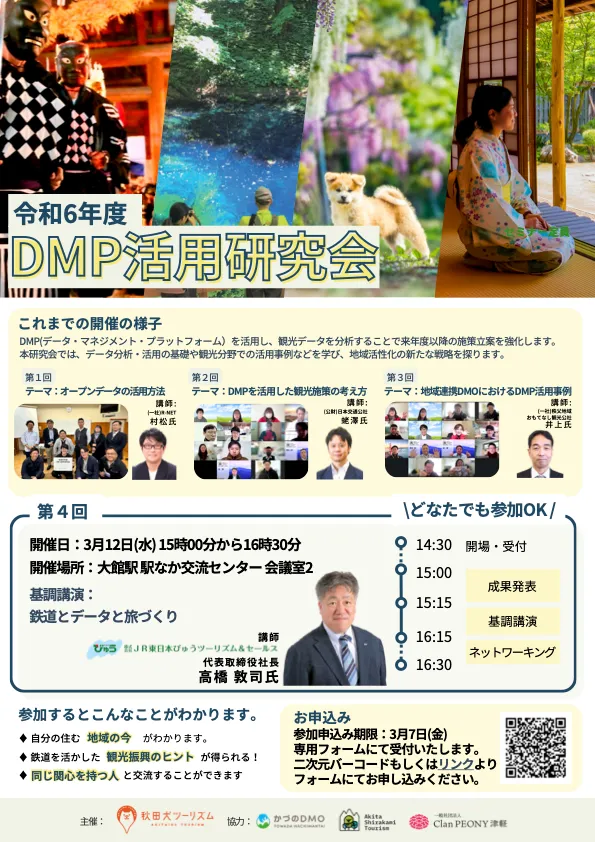 地方創生パートナーズネットワークが運営係を務める「DMP活用研究会」が、2025年3月12日に秋田県で開催されます。本イベントは、秋田県と青森県の観光地域づくり法人(DMO)4団体の連携をもとに、観光データの収集・分析とその活用方法について学ぶ貴重な機会を提供します。