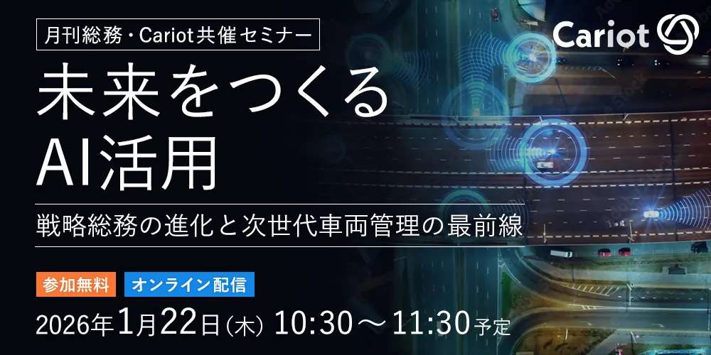 株式会社キャリオット(本社:東京都港区、代表取締役社長:齋藤 洋徳)は、2026年1月22日、株式会社月刊総務(本社:東京都千代田区、代表取締役社長:豊田 健一)が主催するオンラインセミナー「未来をつくるAI活用戦略 総務の進化と次世代車両管理の最前線」に登壇します。このセミナーでは、AIの導入がどのように総務部門の業務を変革し、効率化を図るのかが議論されます。