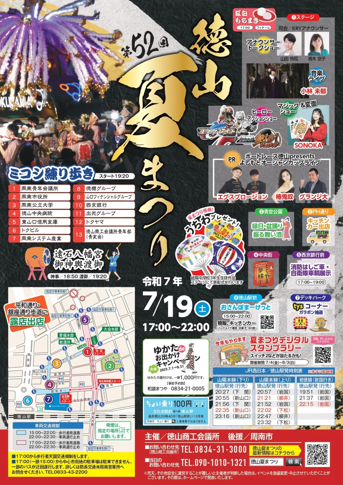 「徳山夏まつり」は、7月19日の17:00から22:00まで行われます。開催場所は周南市の平和通り、PH通り、青空公園、およびJR徳山駅前周辺です。この地域は中心商店街とも接しており、アクセスも非常に良好です。様々な企業や団体が参加し、参加者を楽しませるためにミコシの練り歩きやステージイベントが行われます。また、参加団体には周南青年会議所や市役所、大学、銀行などが名を連ねています。