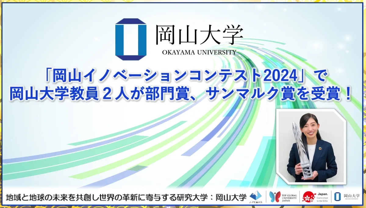 2024年11月23日に岡山芸術創造劇場ハレノワで開催された「岡山イノベーションコンテスト2024」では、岡山大学の教員が素晴らしい成果を上げました。学術研究院ヘルスシステム統合科学学域の宮本愛助教が「ビジネスプラン部門」の部門賞を受賞し、内山淳平准教授が特別賞である「サンマルク賞」が贈られました。
