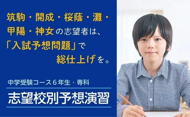 「志望校別予想演習」は、全6校の入試傾向を徹底分析し、過去問題をもとに練り上げた予想問題を通じて、受験生の学力を引き上げることを目的としています。具体的には、筑波大附属駒場や開成、桜蔭、灘、甲陽学院、神戸女学院など、名だたる学校への受験に向けた演習が行われます。