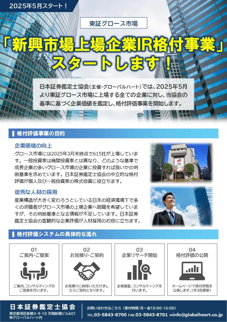 新たに始まる「新興上場企業IR格付評価」事業は、株式市場において企業価値を新しい視点から判定する試みです。このプロジェクトを推進するのは、国における財務状況だけでなく、企業の社会的責任や人材の幸福度も重視する「日本証券鑑定士協会」です。