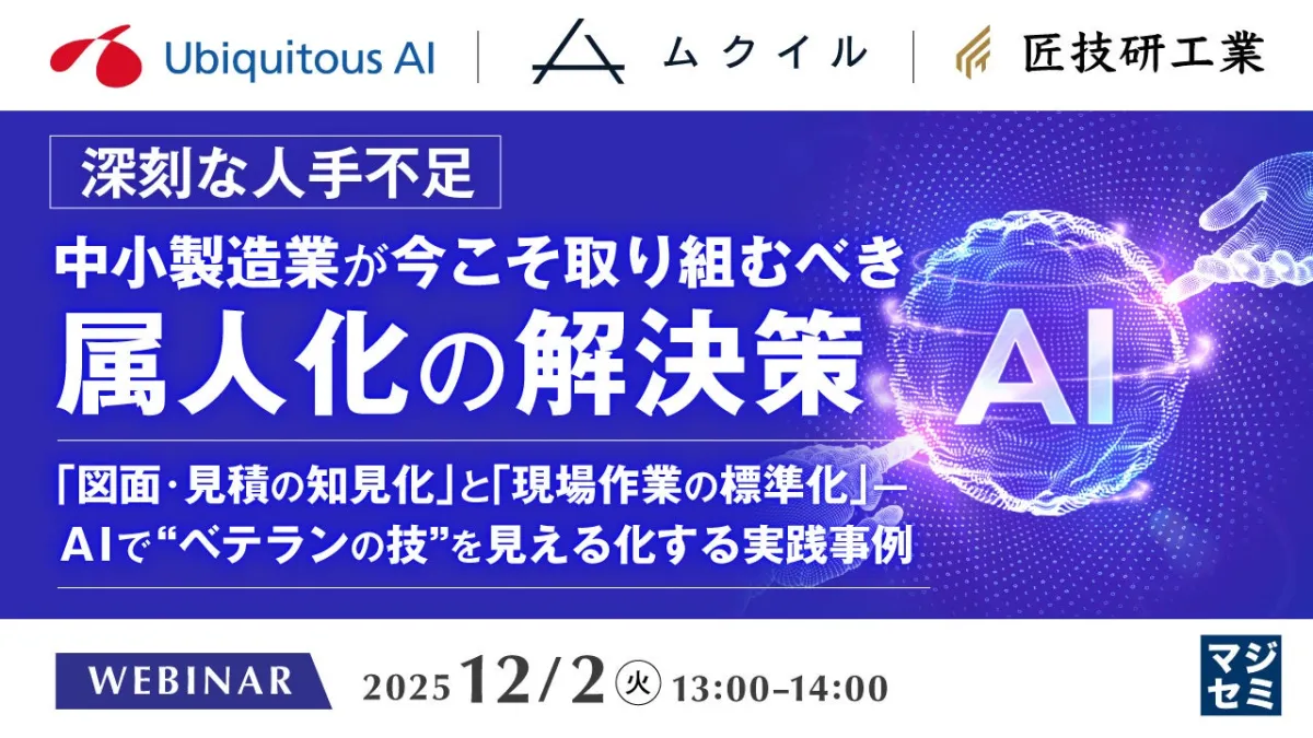 この問題を解消するために、ウェビナーを開催します。最新のAI技術を活用した二つの解決策、「図面・見積の知見化」と「現場作業の標準化」について詳しく説明します。これにより、業務の自動化とノウハウの見える化を進めることが可能になります。
