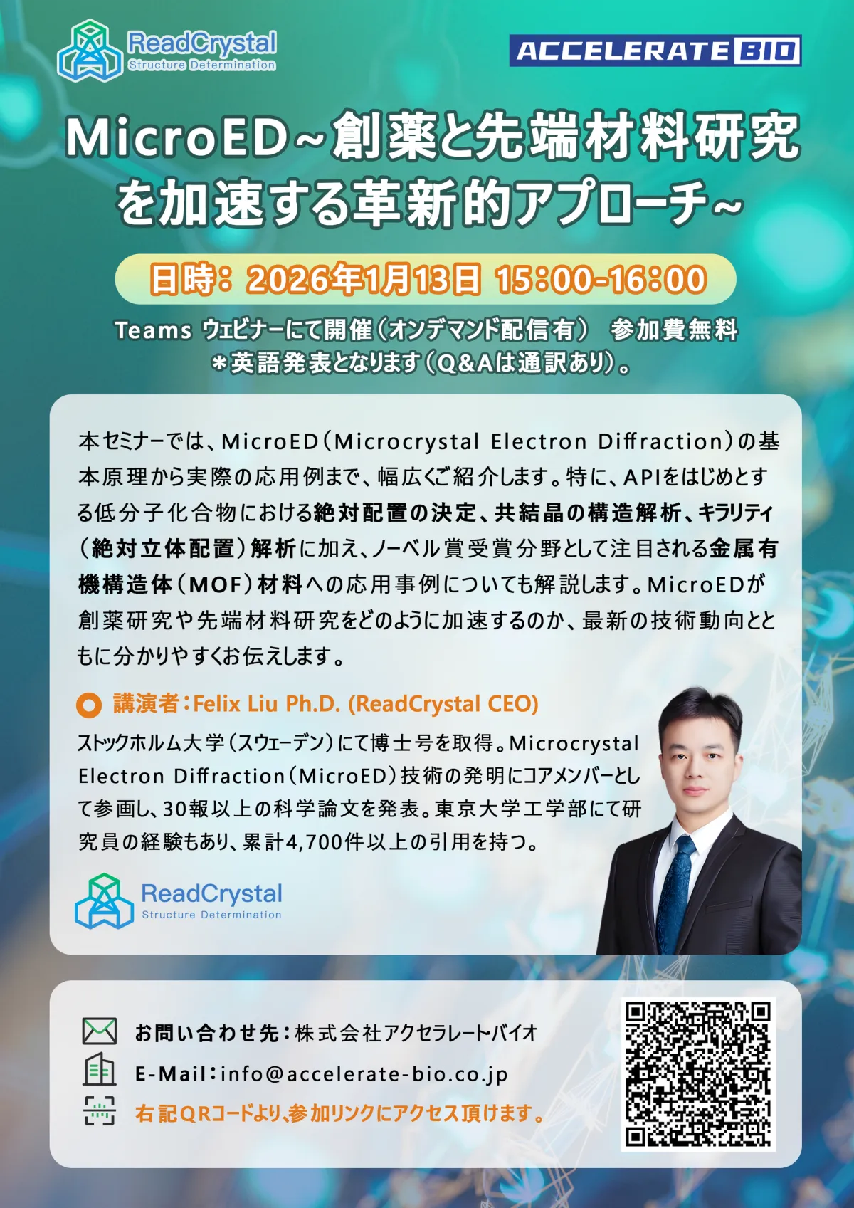 2026年1月13日に、オンラインでのMicroEDセミナーが開催されます。このセミナーでは、構造解析における最新技術であるMicroED(Micro Electron Diffraction)に焦点を当て、その基本原理から実際の応用例まで幅広く紹介します。