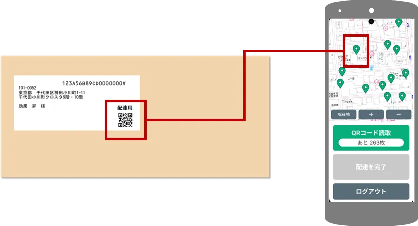 このアプリケーションが提供する機能は多岐にわたります。まず、配達員は事前にポストイン広告の情報を確認し、地図上で配達先を視覚的に把握できます。具体的には、宛名が印字された二次元コードを読み取り、スマートフォンを通じて位置をマーキングすることで、配達先が一目瞭然となります。これにより、配達員は特にノウハウや経験が少ない場合でも、迅速かつ正確な配達が可能になります。