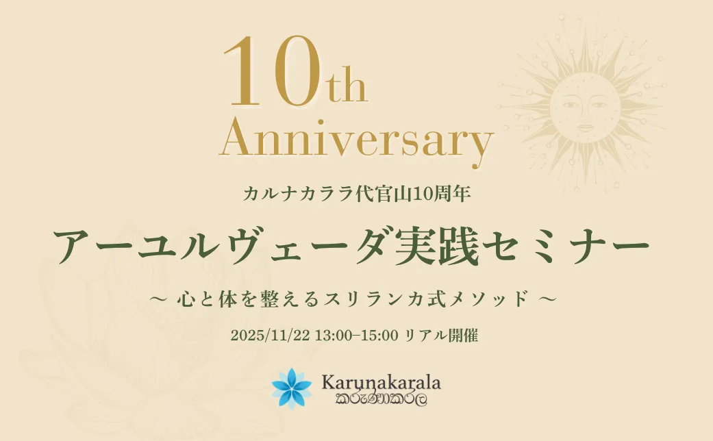 代官山に位置する「カルナカララ アーユルヴェーダサロン」は、2015年の開店以来、アーユルヴェーダの知恵を日本の皆様に提供してきました。この度、10周年を迎えることとなり、特別なセミナーを開催します。