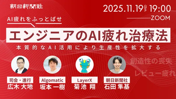 株式会社朝日新聞社が、2025年11月19日(水)にエンジニア向けのオンラインイベント「AI疲れをふっとばせ。エンジニアのAI疲れ治療法 ─本質的なAI活用により生産性を拡大する」を開催します。このセミナーでは、AI技術が普及しつつある中で、多くのエンジニアが直面している“AI疲れ”の原因を探ると共に、その治療法について議論します。