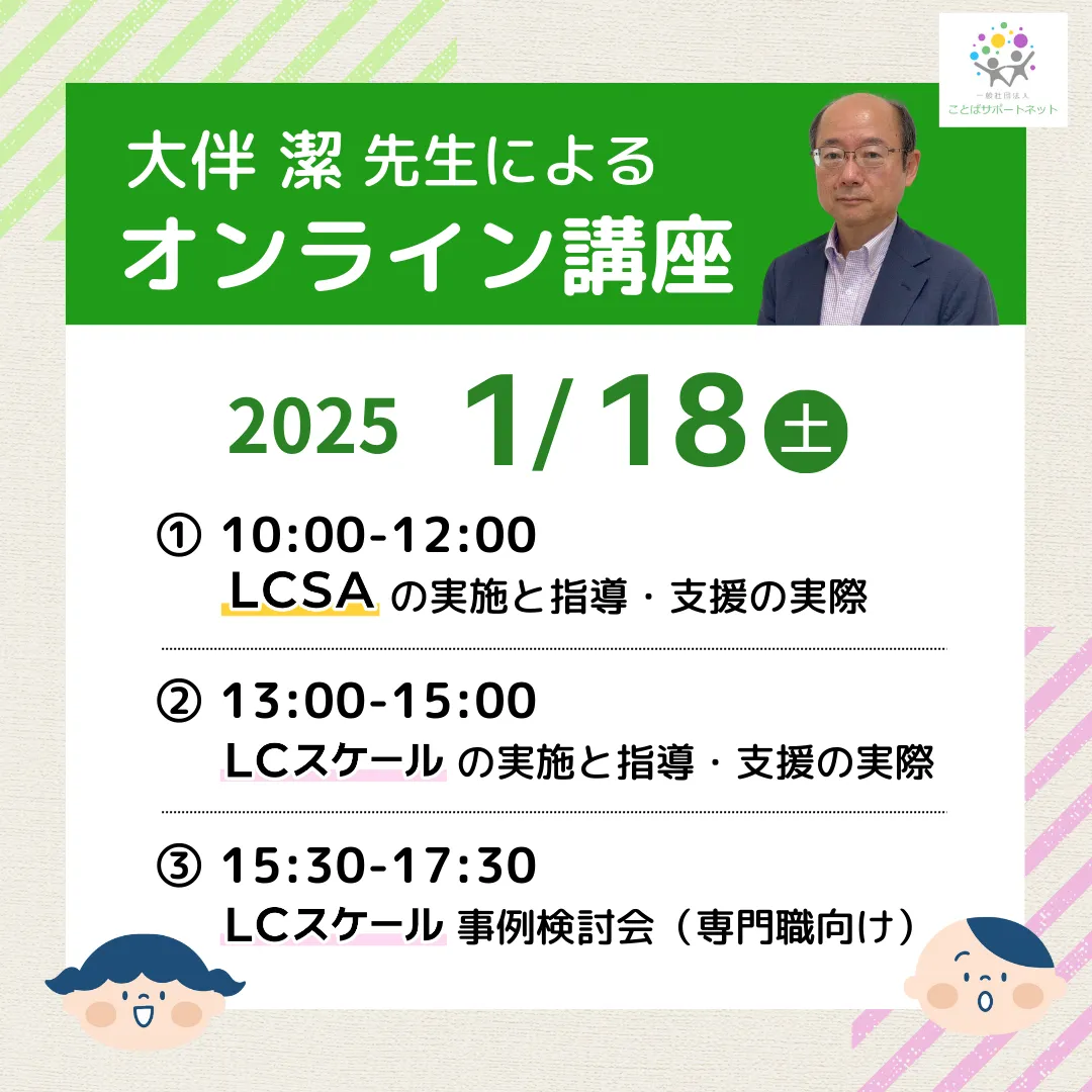 2025年1月18日、大伴潔先生を講師に迎え、子どもたちの言語コミュニケーションの発達を支える「LCスケール」に関するオンライン講座が実施されます。この講座は、言語聴覚士をはじめとする教育関係者や保健師、療育に従事する方々を対象としたもので、具体的な支援方法や評価手法について深く学べる絶好の機会です。