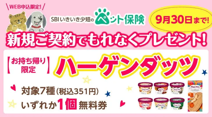 ペットの健康を守るためにペット保険を検討している方に朗報です。SBIいきいき少額短期保険株式会社(東京・港区)が、2024年8月1日から9月30日までの期間に、WEBからのペット保険申し込みを対象にしたキャンペーンを行います。この期間中に「SBIいきいき少短のペット保険」に申し込み、成約した方には、特別なプレゼントとしてハーゲンダッツの無料券が贈られるというものです。