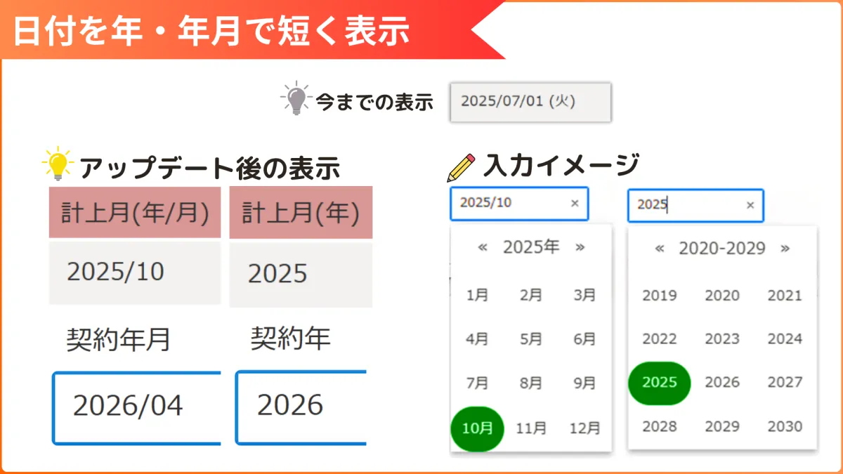 年月日表示機能の追加: ユーザーはデータの表示形式をより見やすく、年・年月形式に設定できるようになります。