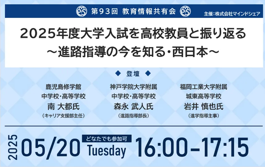 第93回目となる今回の共有会は、2025年度の大学入試を振り返ることをテーマに、西日本で活躍する高校教員3名が登壇します。具体的には、進学指導の実態や生徒・保護者からのフィードバック、そして今後の進路指導に役立つ知見を提供してくれる予定です。その内容は、教育の現場で直面している最新の課題に対する解決策へと繋がることでしょう。