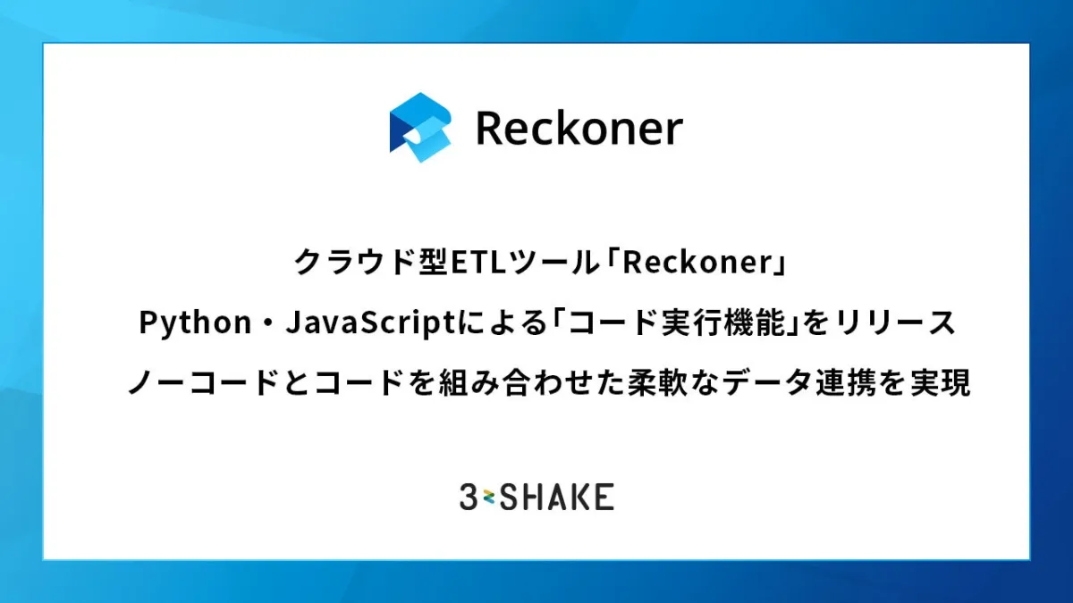株式会社スリーシェイクが展開するクラウド型データ連携ツール「Reckoner」が、新たにPythonやJavaScriptを用いたコード実行の機能を加えました。この機能により、データ連携フローの中でノーコード操作だけでなく、細かい条件分岐や独自のロジック処理などを柔軟に実装することができるようになります。
