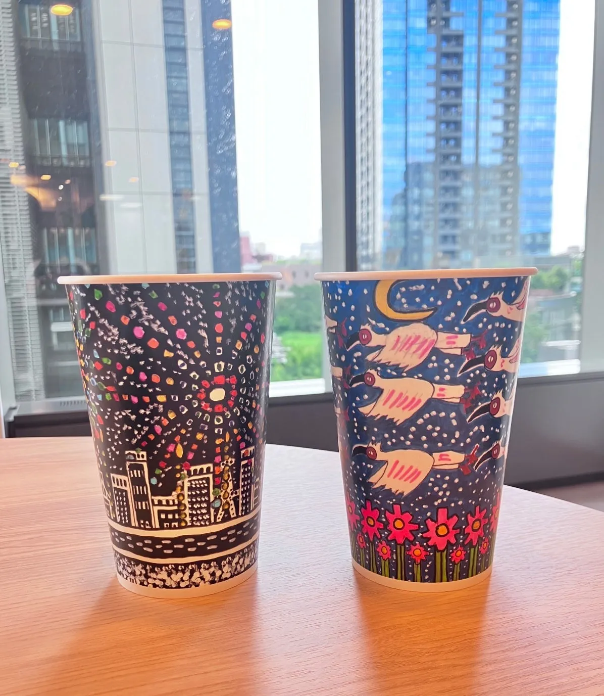 このカップには、新潟県佐渡市在住のアーティスト前田優作さんの2点の作品がデザインされています。ひとつは「Fire works」で、もうひとつは「秋桜と朱鷺」です。前田さんの色とりどりのアートが、商品をさらに魅力的なものにしています。ファンの中には「このカップで飲むと、食事がもっと楽しくなる!」という声も寄せられたほどです。