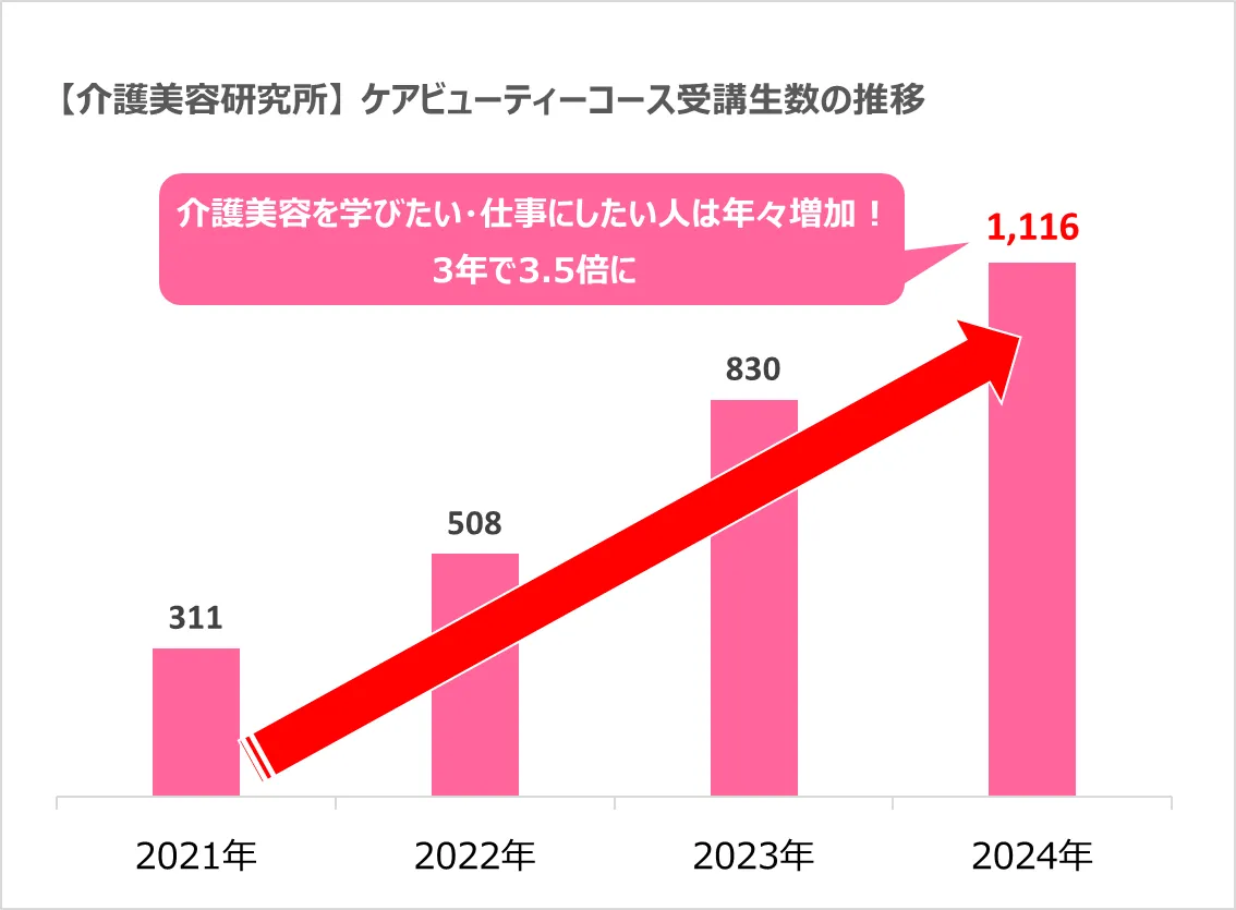 東京都渋谷区に本社を構える株式会社ミライプロジェクトが運営する「介護美容研究所」は、2018年に原宿で開校以来、年々受講者数を増加させています。特に、2024年には受講生数が1,000人を超える見込みで、全国6か所に校舎を展開しています。この動きは、介護人材の不足と高齢者ケアの新しいニーズに応える努力の一環とされています。