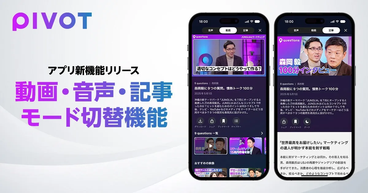 ビジネス映像メディア『PIVOT』が、ユーザーの利便性を高める新機能を導入しました。今回のアップデートで、動画に加え新たに音声版と生成AIが作成した記事版が提供されます。これにより、一つのコンテンツをユーザーのライフスタイルに合わせて柔軟に利用できるようになりました。