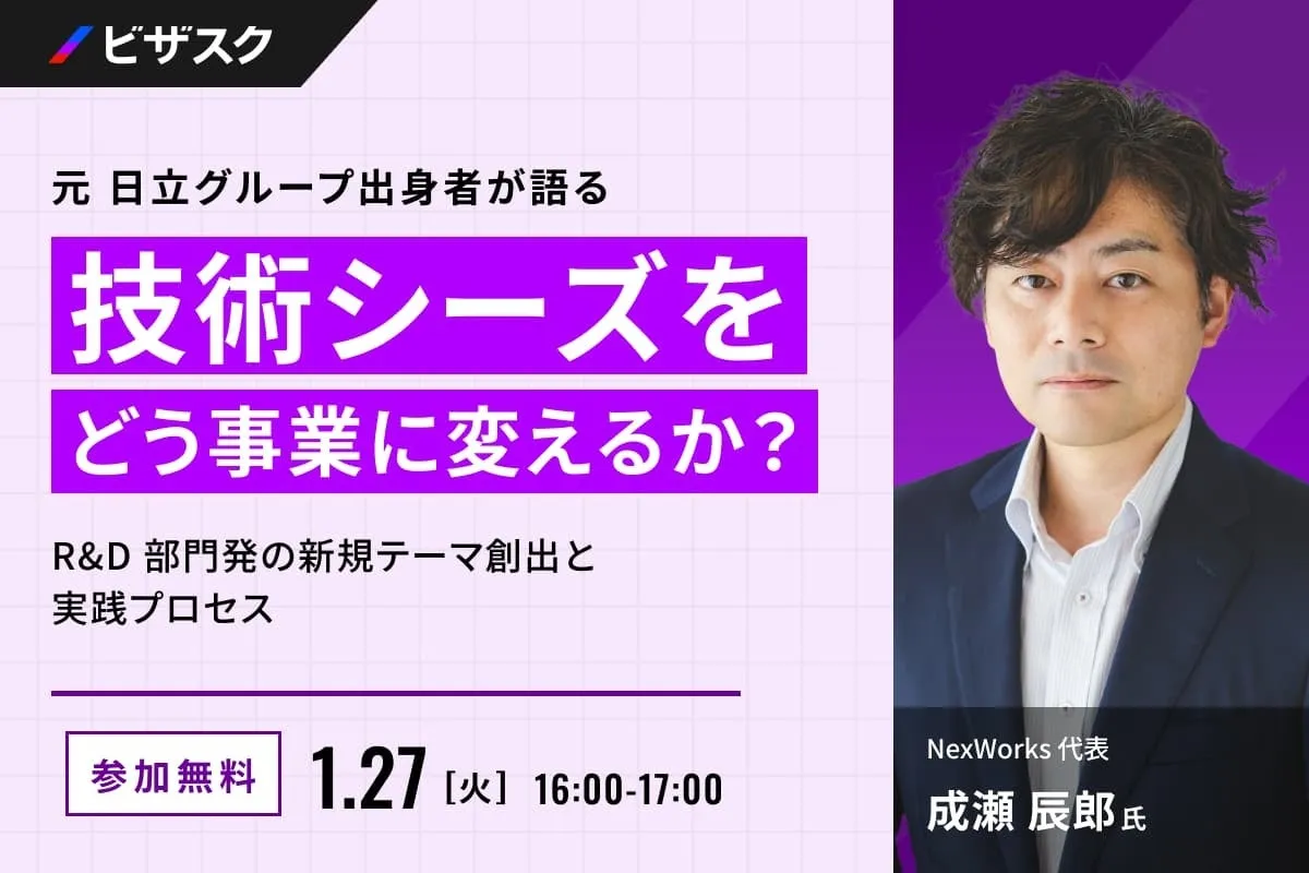株式会社ビザスクは、元日立グループ出身者の成瀬辰郎氏を講師に迎え、技術シーズを事業にどう変えるかをテーマにした無料のオンラインセミナーを1月27日(火)16:00から開催します。このセミナーは、R&D部門が生み出した技術を如何にしてビジネスに結び付けるかを詳しく解説します。