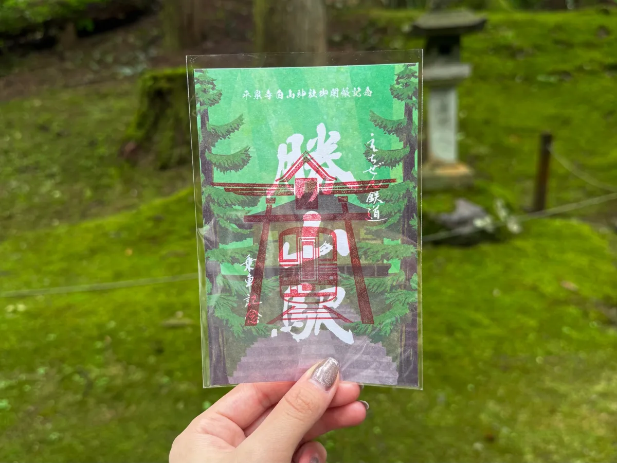 特別御乗印は、平泉寺白山神社の特徴をデザインに取り入れ、両端には雄大な杉木をあしらい、中央に拝殿が描かれています。スタンプの部分には、「二の鳥居」が立体的に表現され、えちぜん鉄道がこの鳥居をくぐる様子がデザインされています。これにより、神社の魅力を感じながら、乗車記念の品としても楽しむことができます。