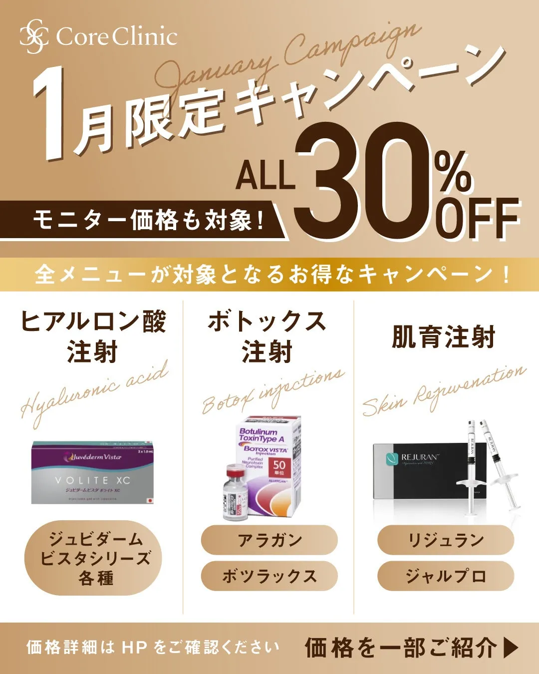 名古屋の中心、栄エリアにある美容外科「Core Clinic(コアクリニック)」は、2026年1月中に特別なキャンペーンを開催しています。このキャンペーンでは、ヒアルロン酸注入、ボトックス注射、そして肌育注射(リジュラン・ジャルプロ)が全て30%OFFの価格で提供され、年始の美容メンテナンスにぴったりです。