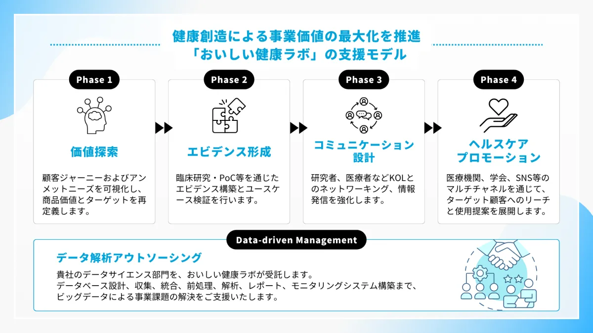 昨今の健康志向の高まりを受けて、多くの食品・飲料企業はマーケット参入を試みています。しかし、機能性表示や栄養価の利益を伝えるだけでは、消費者からの支持を受け続けることは難しいのが現実です。特に、消費者は科学的根拠に基づいた安心感を求めています。このため、おいしい健康ラボは、医療や栄養の専門知識を基にした新しい価値観を企業の商品に融合させ、社会に提供することを目指します。