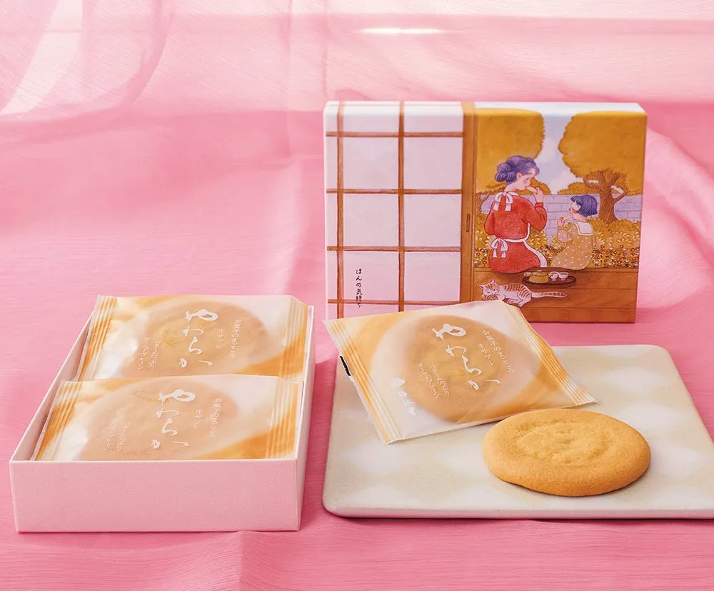 この商品には、梅林堂の人気商品「やわらか」が添えられています。お菓子は生サブレ「やわらかゴールドプレーン」として知られ、厳選したバターとしっとりと焼き上げた生地が特徴。満たされるお菓子本来の美味しさは、世代を問わず多くの方に愛されています。