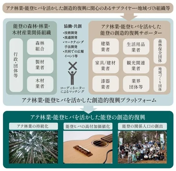 近年、能登半島では未曾有の災害に見舞われ、多くの山林や製材所が被害を受けました。これにより、地域の林業は困難な状況に置かれており、持続可能な復興策が急務とされています。このプラットフォームでは、アテ林業と能登ヒバを活用し、関係者の協力を得ながら新たな価値を創出する計画です。