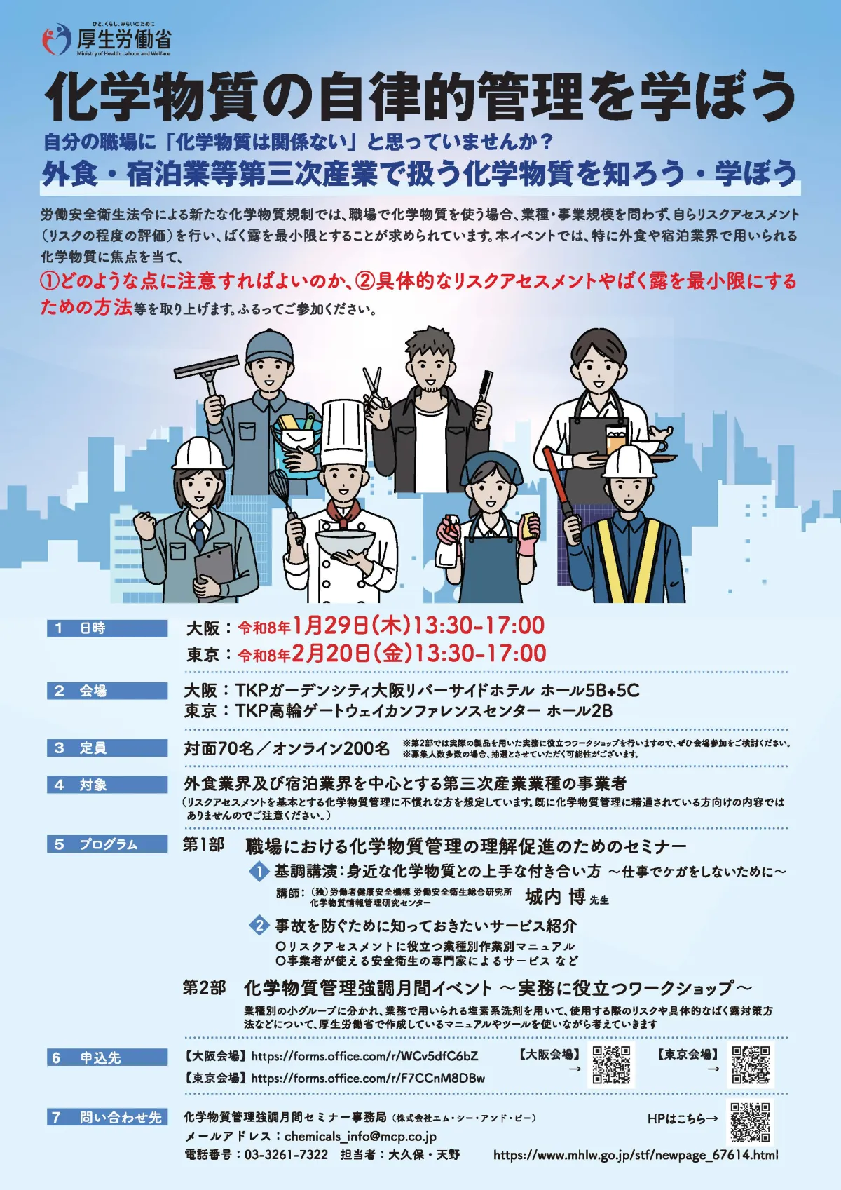厚生労働省が主催する「化学物質の自律的管理を学ぼうセミナー」が、2024年1月29日(木)に大阪、2月20日(金)に東京で行われます。このセミナーは、令和6年4月から施行される新しい化学物質規制に対応するための内容で、業種に関係なく多くの事業者が参加できます。
