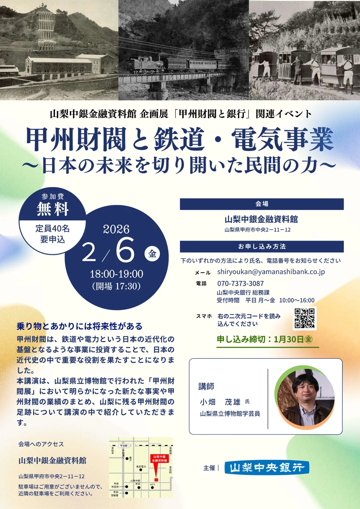 山梨中銀金融資料館では、地域社会への貢献を目的として、特別講演「甲州財閥と鉄道・電気事業」を開催する運びとなりました。この講演は、株式会社山梨中央銀行の頭取である古屋賀章氏の主導のもと、山梨県立博物館の学芸員である小畑茂雄氏をお迎えして行われます。