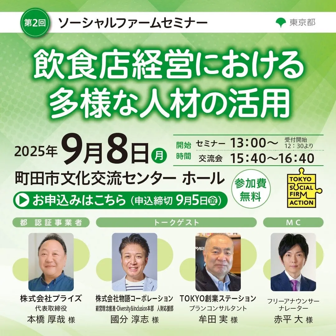 東京都では、飲食店経営における多様な人材の活用をテーマにした第2回ソーシャルファームセミナーを2025年9月8日(月)に開催します。このセミナーは、東京都が認証した社会的企業であるソーシャルファームの成長を促進するために行われ、様々な理由で就労が困難な方々の雇用に焦点を当てています。