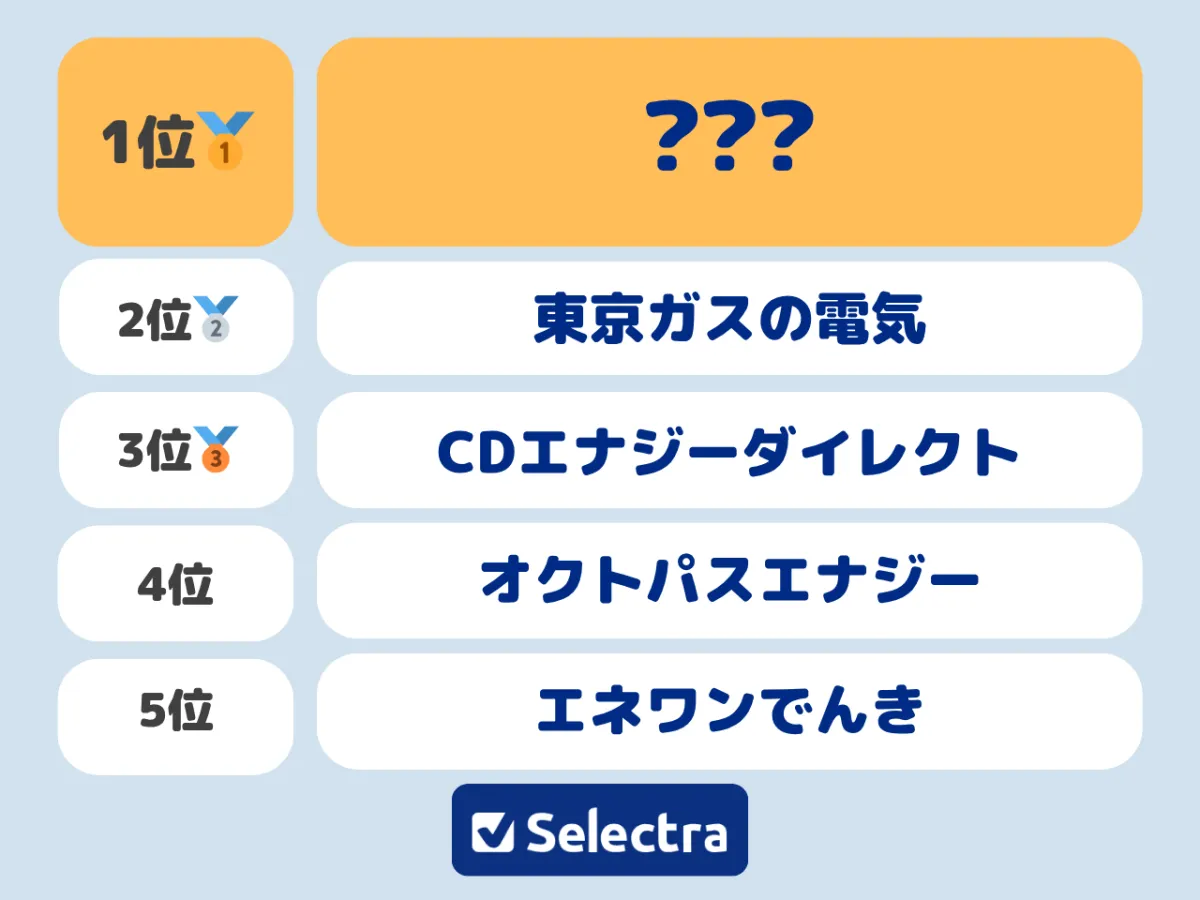 - - 2位は「東京ガスの電気」: 知名度の高い東京ガスも2位にランクイン。料金の安さは他社に劣ったものの、消費者は企業の信頼性を重視していることが分かります。