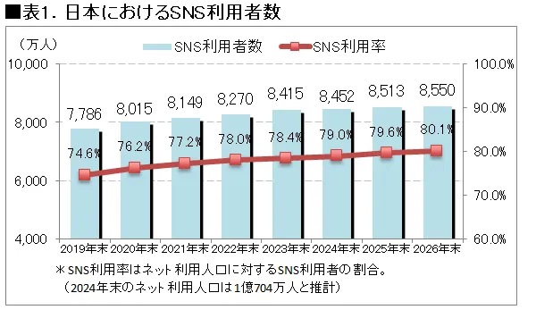 株式会社ICT総研によると、2024年度の日本におけるSNS(ソーシャルネットワーキングサービス)利用者はおよそ8,452万人に達する見込みです。これは日本全体のネットユーザー規模1億704万人に対して、79%の普及率にあたります。この数値は、政府によるデジタル化が進む中で高齢者を含む幅広い世代がスマートフォンを通じてSNSを利用していることを反映しています。また、2026年にはさらに8,550万人に達する見込みで、普及率は80.1%に達するでしょう。