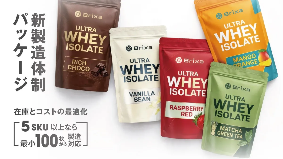 Brixaは2026年2月24日より、パッケージ製造サービスにおいて、SKU数に応じて最小ロットが段階的に下がる新たな製造仕様を導入します。この制度により、5SKU以上の発注の場合には最小ロットが各SKUあたり100枚まで引き下げられることになります。これまでは1SKUあたり最小500枚が必要でしたが、新たな仕様ではSKU数が増えるごとに最小ロットが減少する仕組みです。これにより、メーカーや商品開発者は、より少ない初期ロットで商品のテスト販売が行いやすくなります。