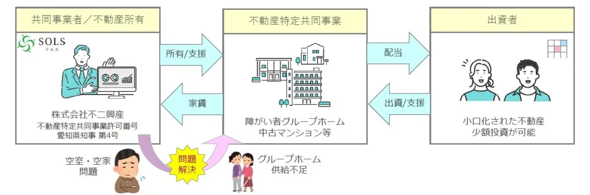 現在、障がい者支援に関しては寄付を前提とした事業が多く、必要とされるグループホームの数は不足しています。このような需要に応えるべく、私たちの株式会社不二興産では、中古戸建を購入し、リフォーム後に運営者に貸し出す形で、グループホーム事業を展開しています。
