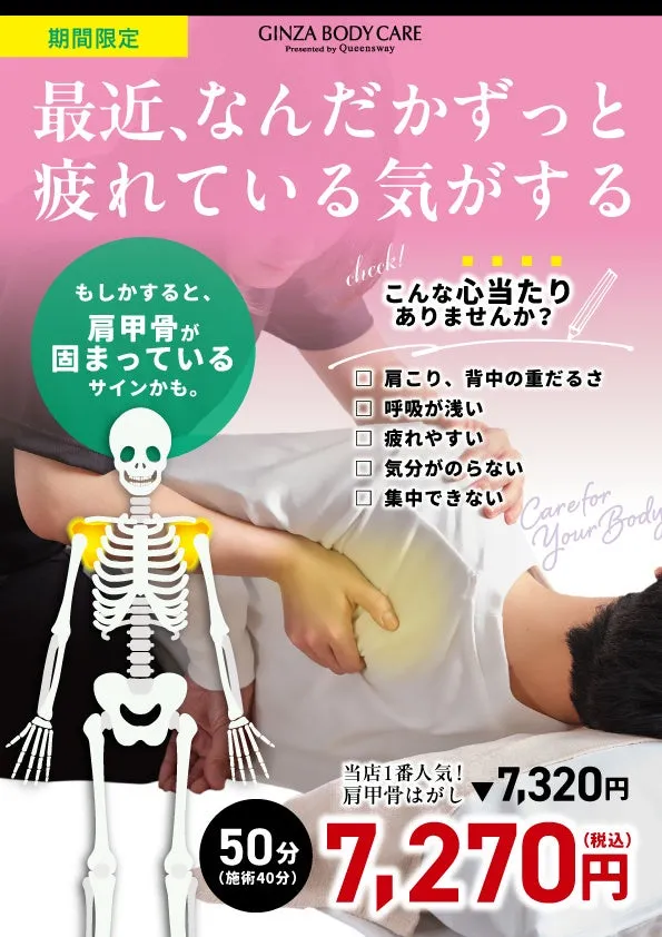 東京と大阪に展開するストレッチ&ボディケア専門店「GINZA BODY CARE」では、2025年9月限定で、肩甲骨に特化した「肩甲骨はがし」コースを特別価格にて提供します。身体の疲れや不調を和らげたい方にとって、この機会は見逃せません!