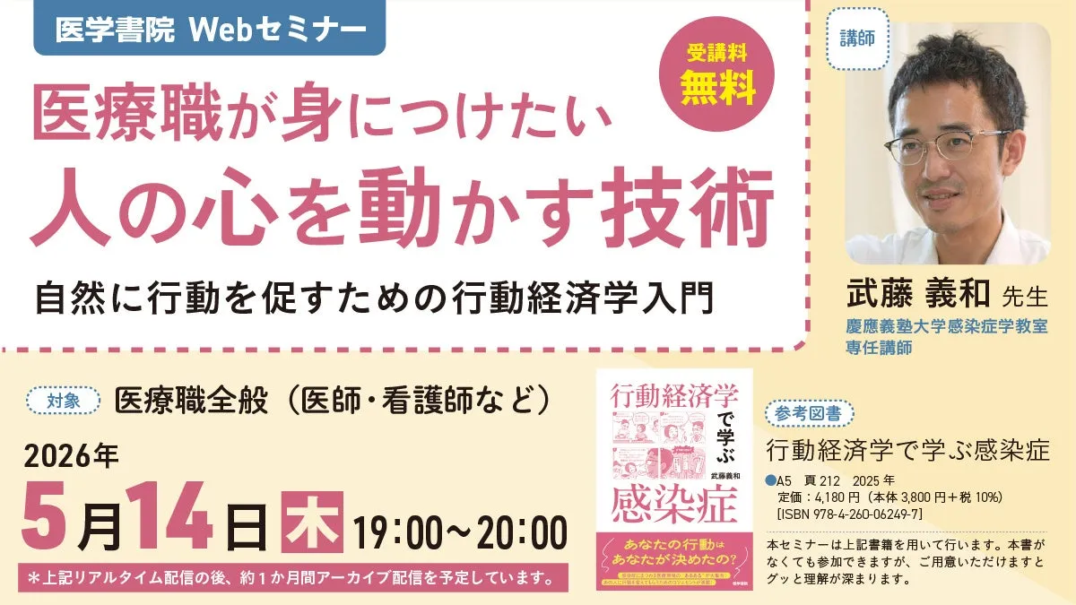株式会社医学書院が主催する、医療従事者向けの無料Webセミナー『医療職が身につけたい 人の心を動かす技術~自然に行動を促すための行動経済学入門』が、2026年5月14日(木)19:00から20:00まで開催されます。このセミナーでは、医療の現場で日常的に直面する数々の行動課題に対して、行動経済学の視点から解決策を提供します。