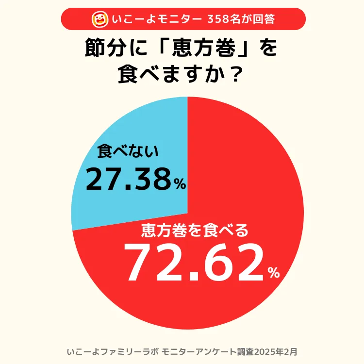 現代の子育て家庭において、節分の過ごし方が変化しています。2025年に実施された調査によれば、節分の主役は「恵方巻」であることが浮き彫りになりました。アンケートによると、恵方巻を食べる家庭は約72.6%、一方で豆まきをする家庭は58.9%と、恵方巻の人気が高まっていることが確認されました。