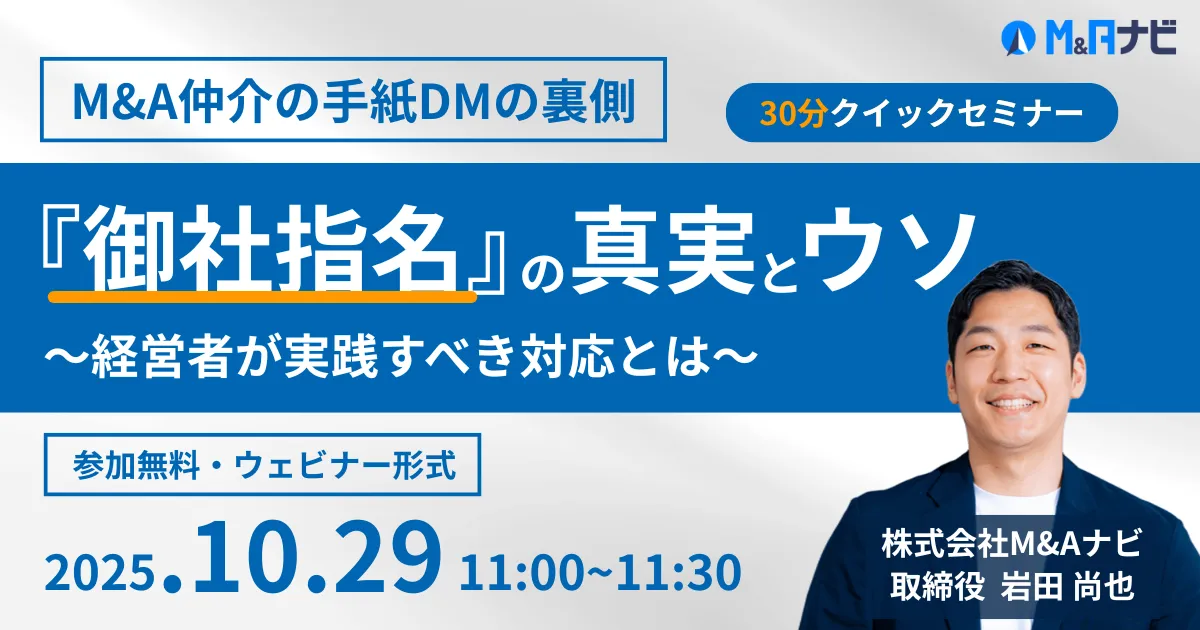 株式会社M&Aナビは、2025年10月29日(水)11時00分からオンラインで「M&A仲介の手紙DMの裏側」のセミナーを開催します。たったの30分で、営業手紙の内容やそこに隠された意図を理解し、どのような対応をとるべきかを学ぶことができます。