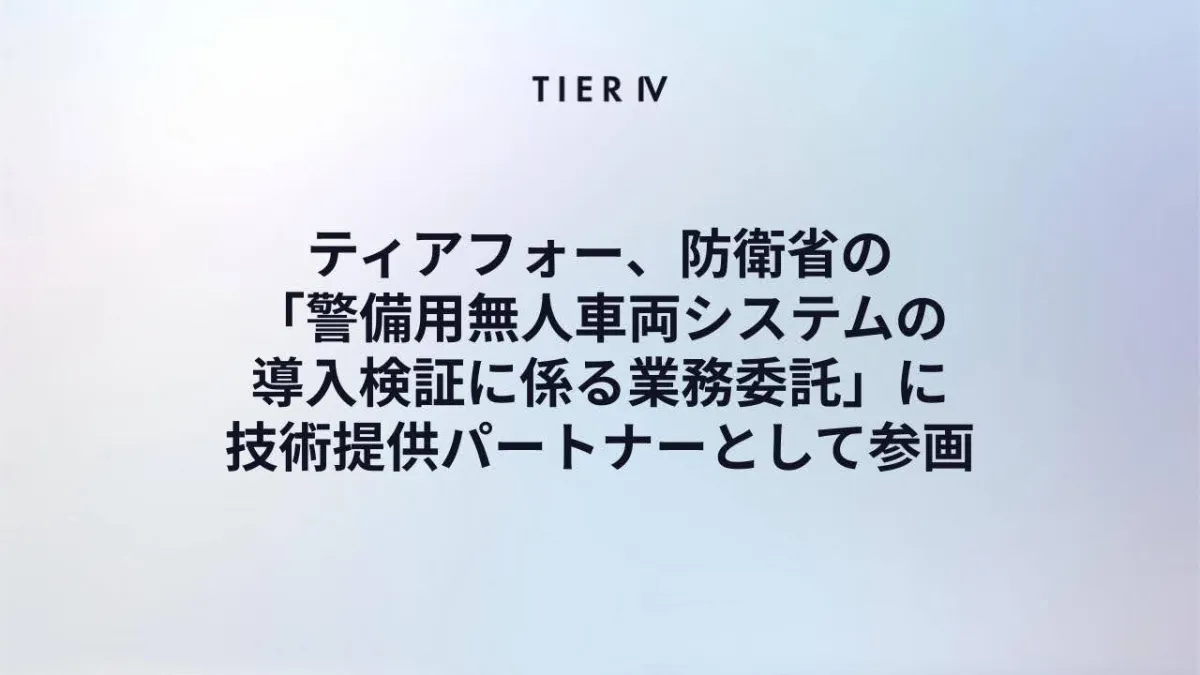 株式会社ティアフォー(以下、ティアフォー)は、自動運転技術の普及を目指し、防衛省の「警備用無人車両システムの導入検証に係る業務委託」に技術提供パートナーとして参画することを発表しました。このプロジェクトは、自律走行機能を備えた警備用無人車両(UGV)システムの実用性を評価することを目的としています。これにより、陸上自衛隊の警備業務の効率化と高度化を図ります。