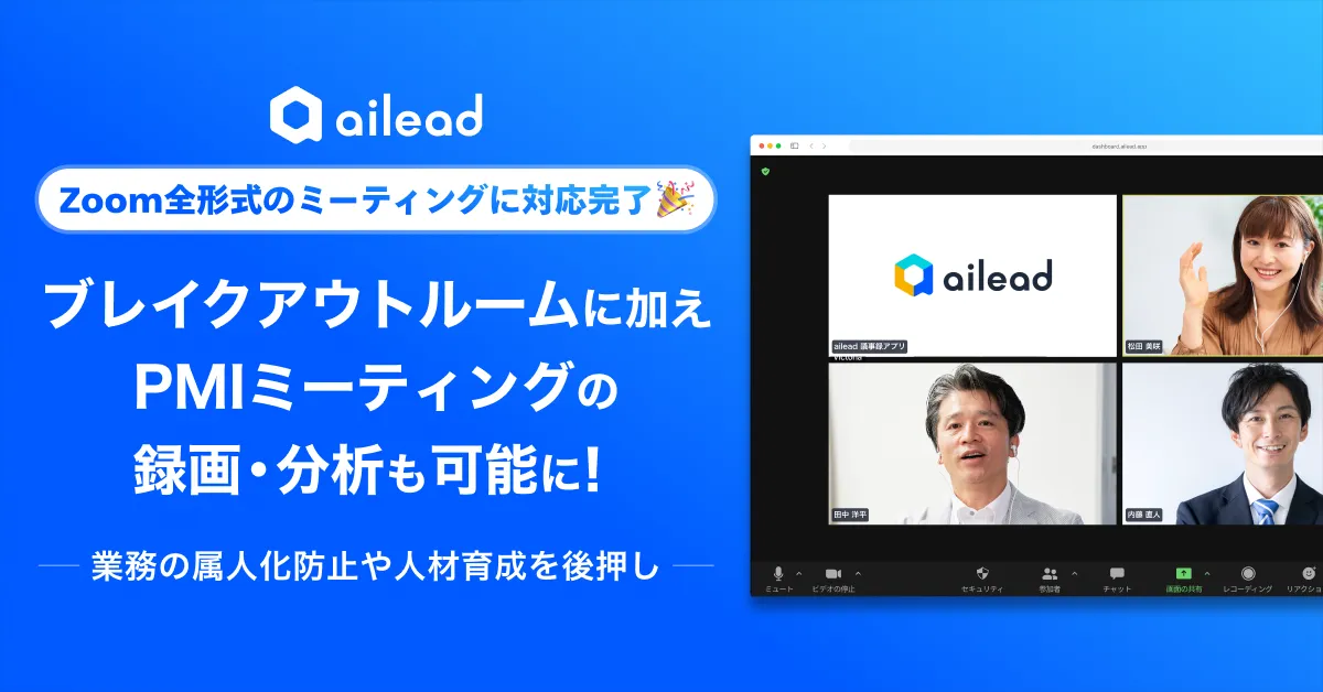 株式会社aileadが提供する商談解析クラウド「ailead」は、Zoom全形式のミーティングに対応を完了しました。最新のアップデートにより、PMI(パーソナルミーティングID)を利用したミーティングでも、自動的に録画・分析が行える機能が追加されています。これにより、従来可能だった通常ミーティングやブレイクアウトルームに加え、PMIミーティングもサポートし、営業活動や社内外のコミュニケーションデータの記録が多様化します。