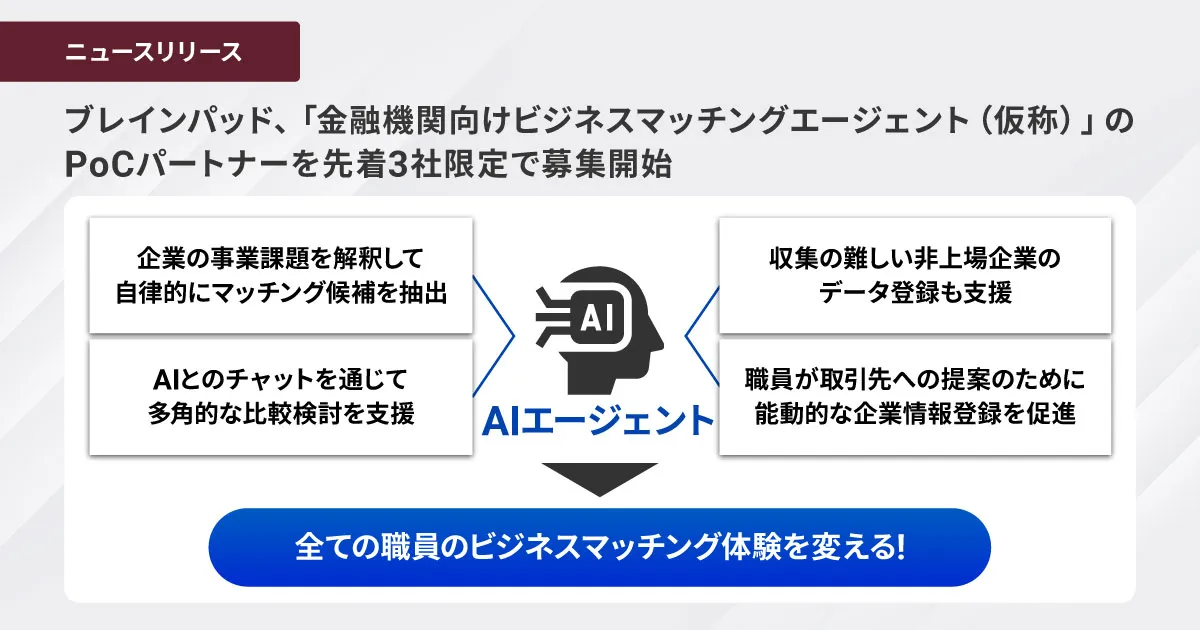 株式会社ブレインパッド(本社:東京都港区、代表取締役社長 CEO 関口 朋宏)が、金融機関を対象にした「金融機関向けビジネスマッチングエージェント(仮称)」のPoC(Proof of Concept)パートナー企業募集を発表しました。この取り組みでは、先着で3社のみが受け入れられ、2026年5月から7月にかけて実施される予定です。