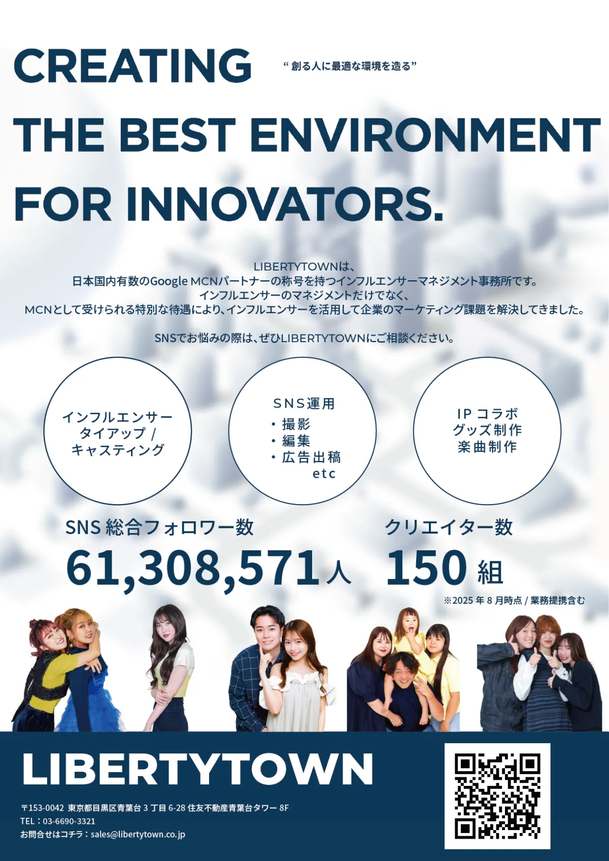 クリエイターマネジメント事務所である株式会社リバティタウンが、2025年8月19日(火)から20日(水)にかけて、東京都立産業貿易センター浜松町館にて開催される「E-Commerce Expo / SNS運用戦略Expo 2025」に出展します。正式なスタートは2017年の設立以降、リバティタウンは「創る人に最適な環境を造る」を掲げ、クリエイターの可能性を広げるために、さまざまなサービスを提供しています。