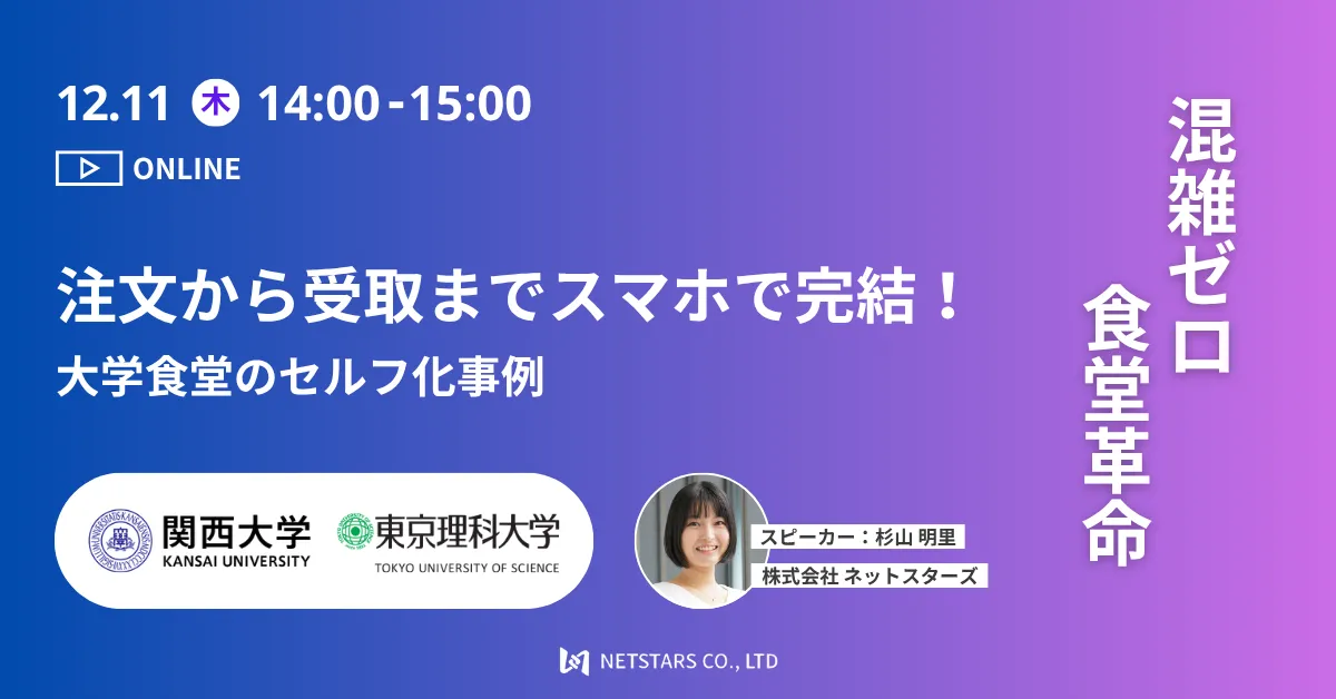 株式会社ネットスターズは、2025年12月11日(木)の14:00から、オンラインでウェビナー「注文から受取までスマホで完結!大学食堂のセルフ化事例」を開催します。このウェビナーでは、大学食堂におけるオペレーションの効率化とデジタル化をテーマに、実際の導入事例を交えながら、レジ業務を削減するトータルソリューション「レジレスプラットフォーム」について詳しく説明します。