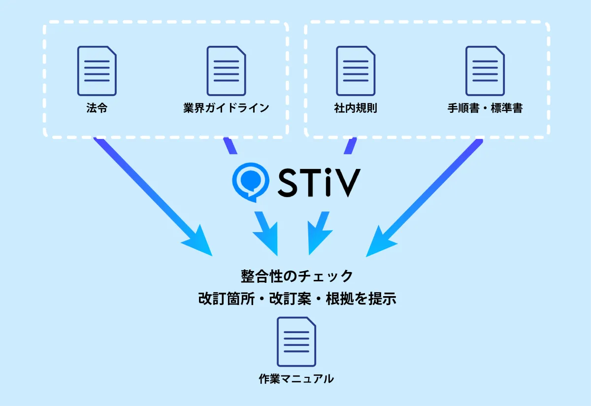 STiVの「文書チェック・作成支援」は、最新の法改正情報をもとに、必要な改訂案を瞬時に作成します。従来は文書作成に1週間程度かかっていたプロセスを短縮し、業務の効率化を図ることができます。
