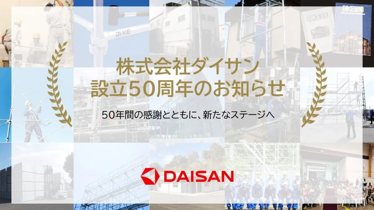 株式会社ダイサン(代表取締役社長:藤田武敏)は、2025年4月1日で設立50周年を迎えます。この重要な節目を迎えることができたのは、長年にわたり支えてくださったお客様や地域社会、関係者の皆様のおかげです。心から感謝申し上げます。これからも、50年間の経験を生かし、パーパス「人と現場を守り抜く」の実現を目指して、社会課題の解決に貢献する姿勢を貫き、新たなステージへと進んでまいります。